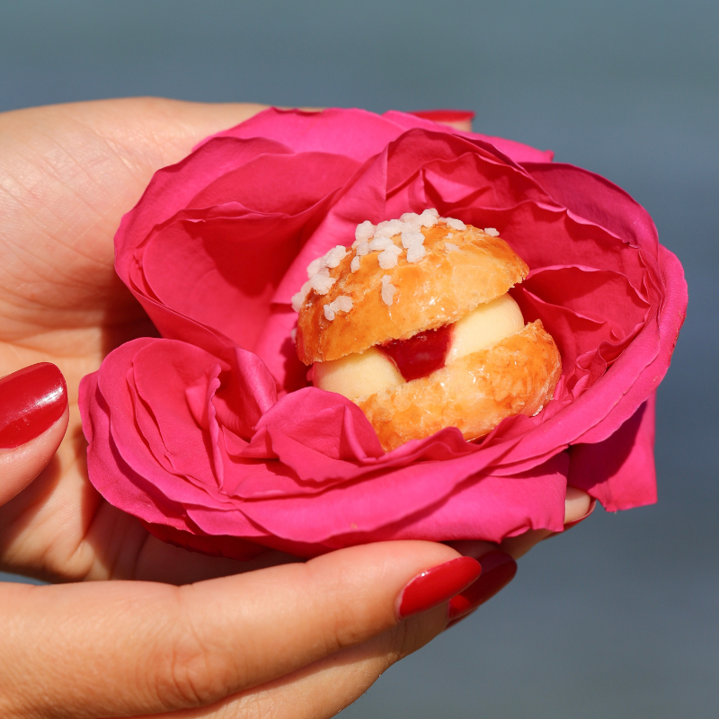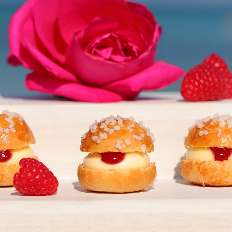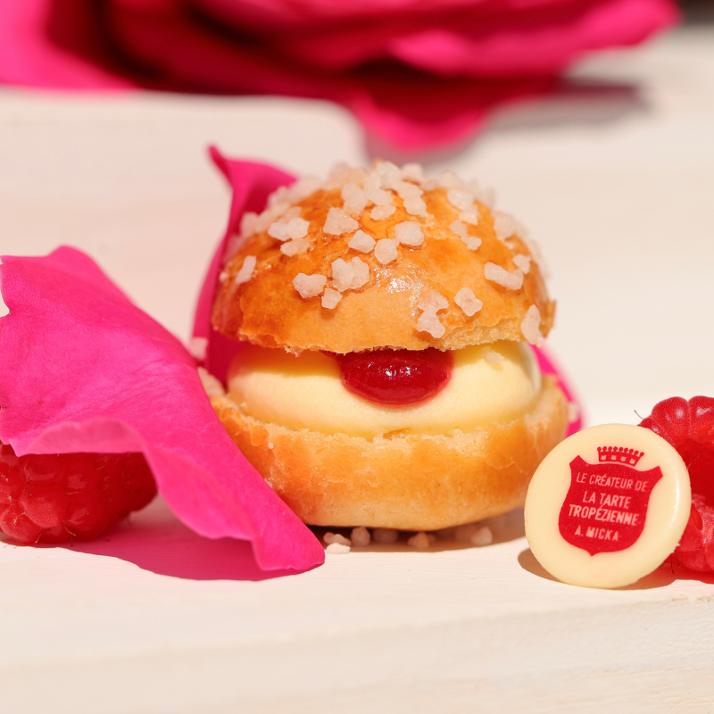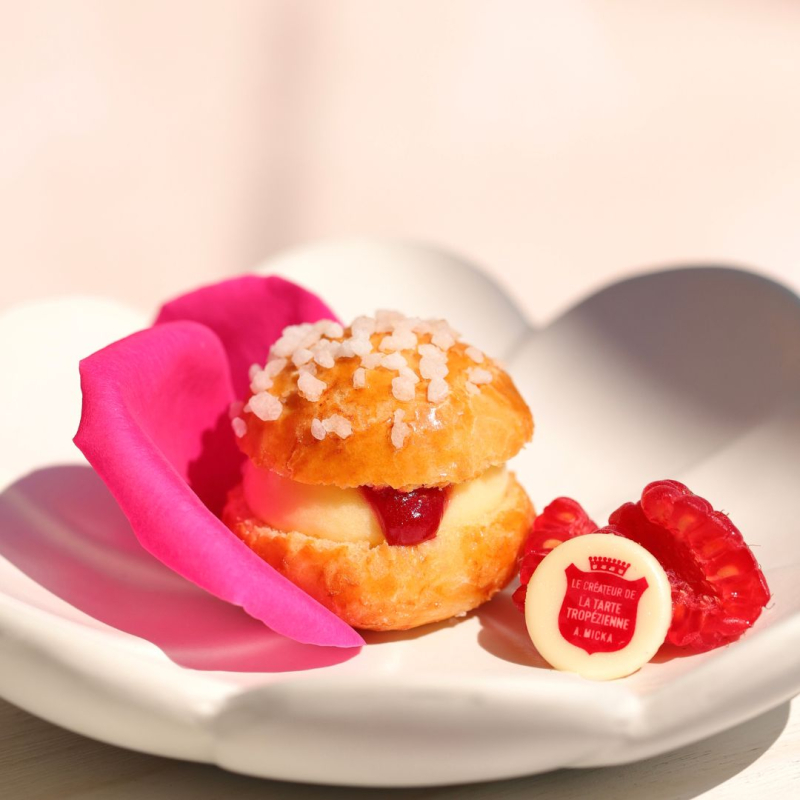Soft brioche, original Tropézienne cream, and a heart of raspberry jam infused with Centifolia rose petals, a symbol of the French Riviera.