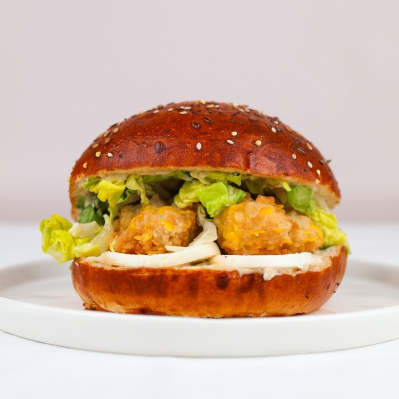 A golden, fluffy brioche filled with crispy French chicken, creamy Caesar sauce, romaine lettuce, hard-boiled eggs, and Grana Padano. A perfect balance of tenderness, crunch, and richness.
