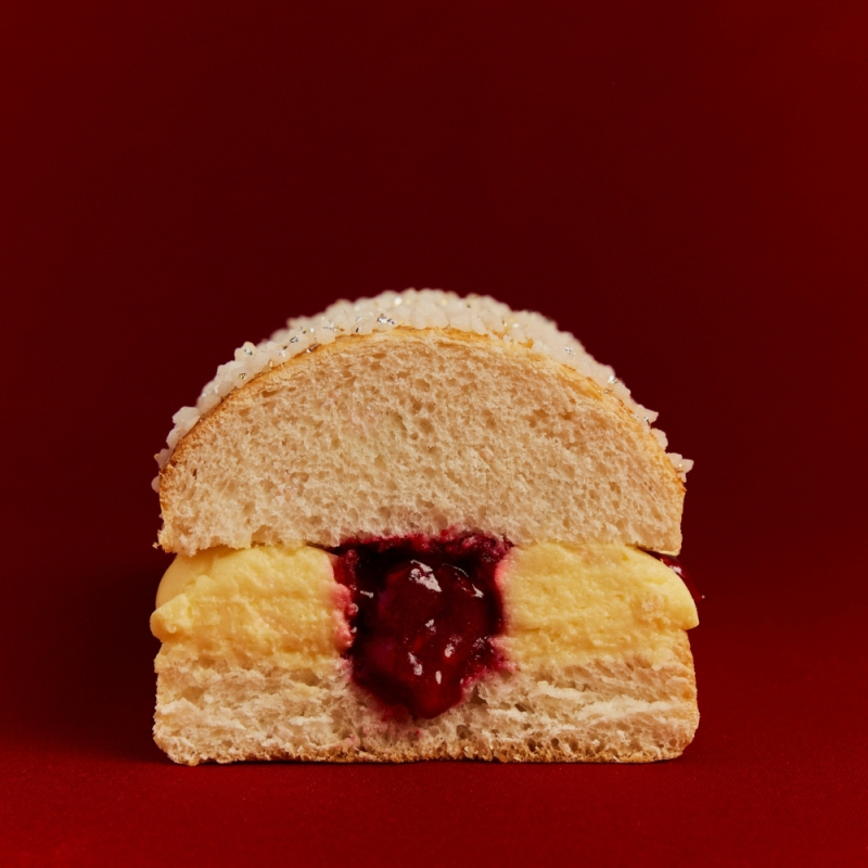 La crème Tropézienne originale se marie à une compotée maison et un coulis de fruits des bois (fraises, groseilles, framboises, cerises, mûres, myrtilles). Des zestes de citrons verts et jaunes renforcent la fraîcheur acidulée, le tout parsemé de paillettes dorées.