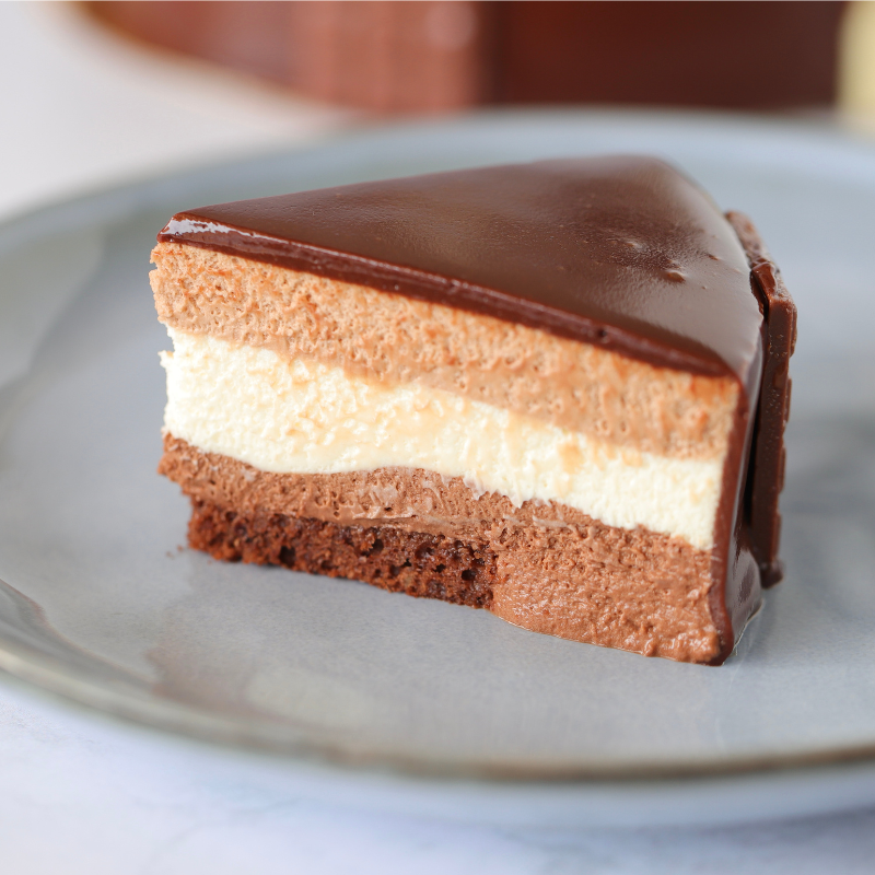 Trois mousses, chocolat blanc, chocolat au lait et chocolat noir, sont dressées sur une génoise au chocolat noir.